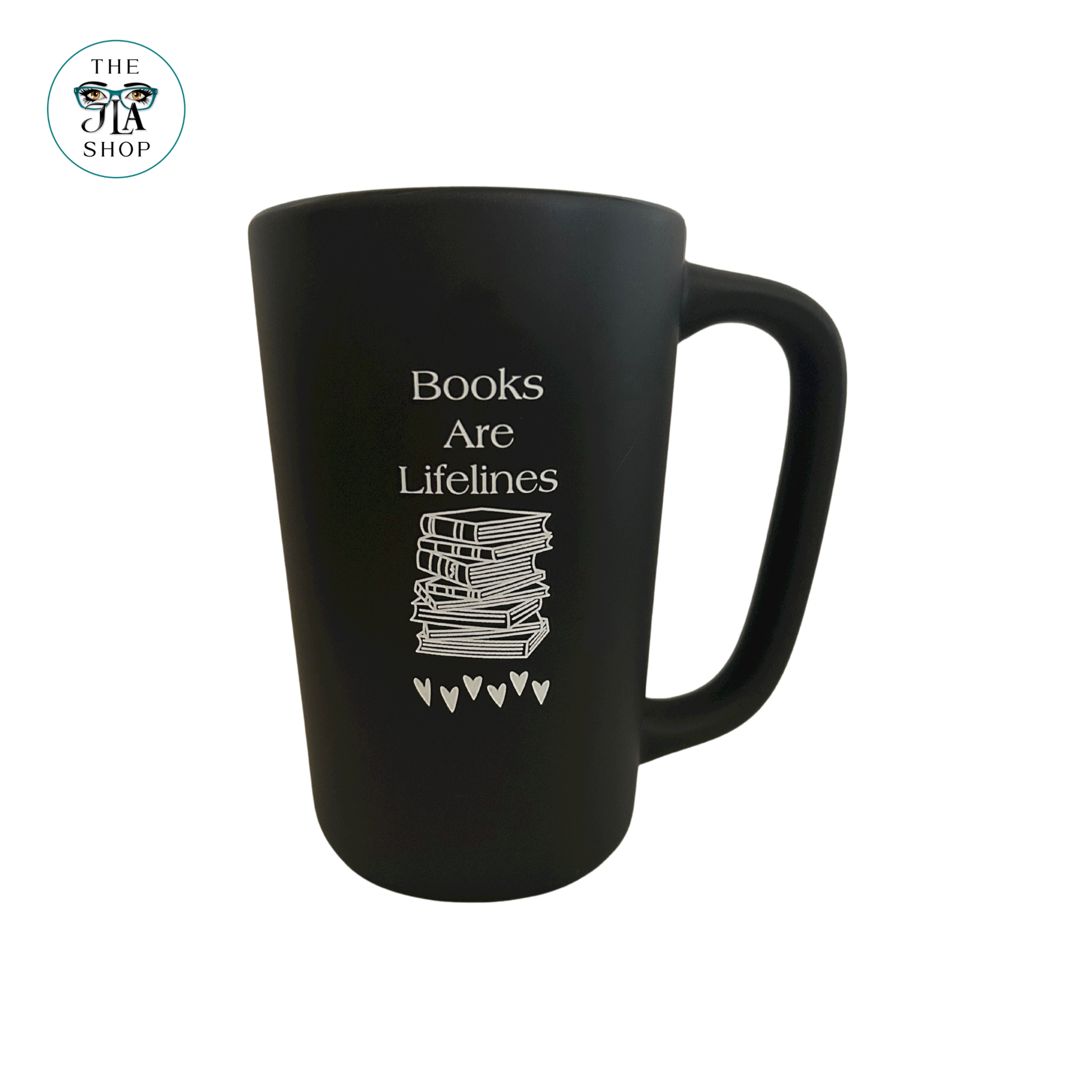 This 16oz. matte black mug with white features artwork designed by JLA herself!