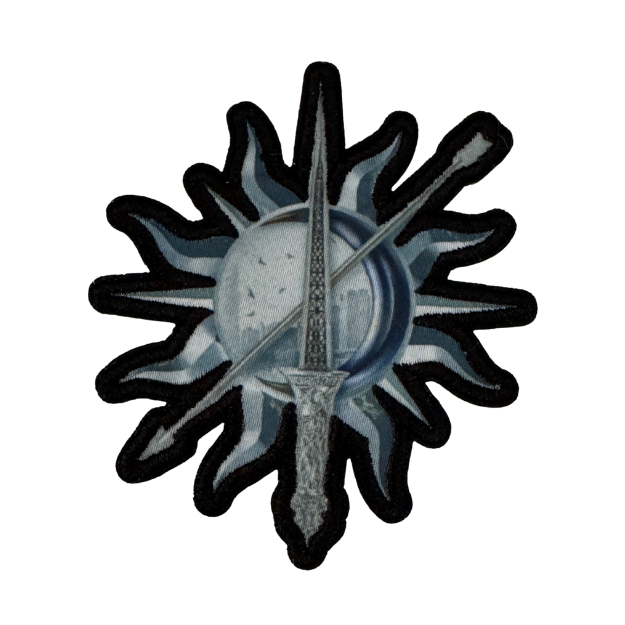 Oversized die-cut metal bookmark and 3" woven, self-adhesive patch, featuring artwork from The Primal of Blood and Bone.
