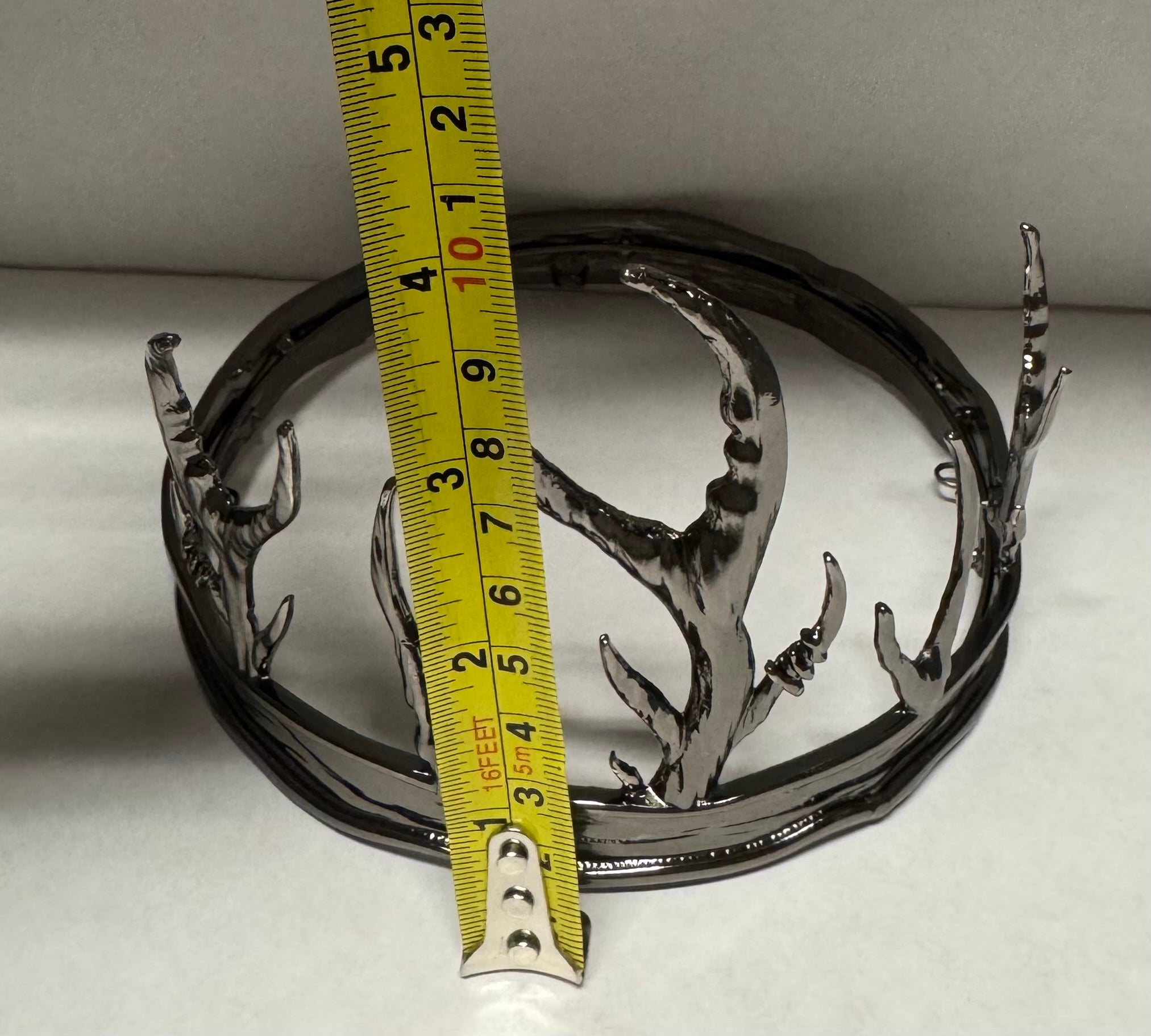 Dark gray finish alloy crown measures 5.5" and stands approximately 4" at the top of the center branch. Unlike our previous crown replicas, this one cannot be stretched but does include loops along the interior; use them with pins or other accessories to secure it in place (if using it for cosplay), or display it on your bookshelf.